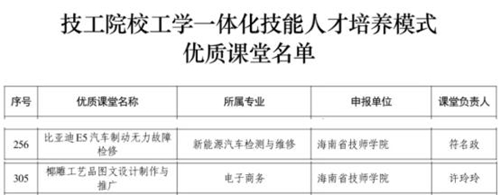 近日,人力资源社会保障部办公厅发布了《关于公布技工院校工学一体化技能人才培养模式优质课堂名单的通知》,经各技工院校申报、省级遴选、部级统筹等多轮评审,全国共评选出369个优质课堂。其中,我院车辆工程系新能源汽车检测与维修专业教师符名政主讲的《比亚迪E5汽车制动无力故障检修》和计算机应用系电子商务专业教师许玲玲主讲的《椰雕工艺品图文设计制作与推广》等2门课程成功入选。
